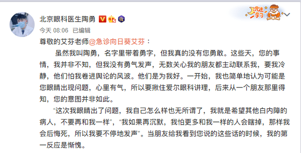 虽然我叫陶勇,名字里有勇敢这个词,但我真的没有你勇敢。这几天,我不是不知道你的事情,而是没有勇气说出来。无数关心我的朋友主动联系我,让我冷静下来。他们怕我卷入舆论风暴。他们是为了我好。刚开始我还单纯的觉得你眼睛可能有问题,心里有气,只好抓住爱尔眼科来讲道理。后来从一个朋友那里了解到,你的本意并不是这样。